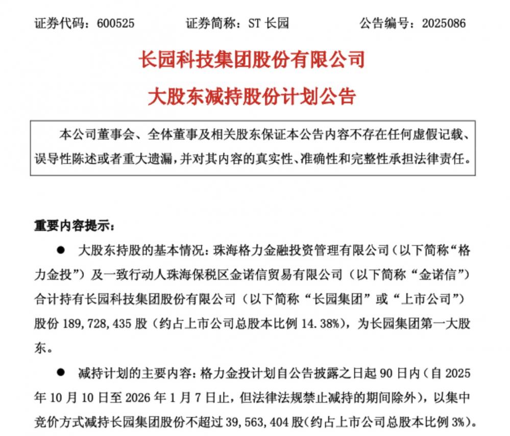 10月9日晚,ST长园(600525)(600525.SH)一纸大股东减持公告,再度将这家深陷治理争议的上市公司推上风口浪尖。